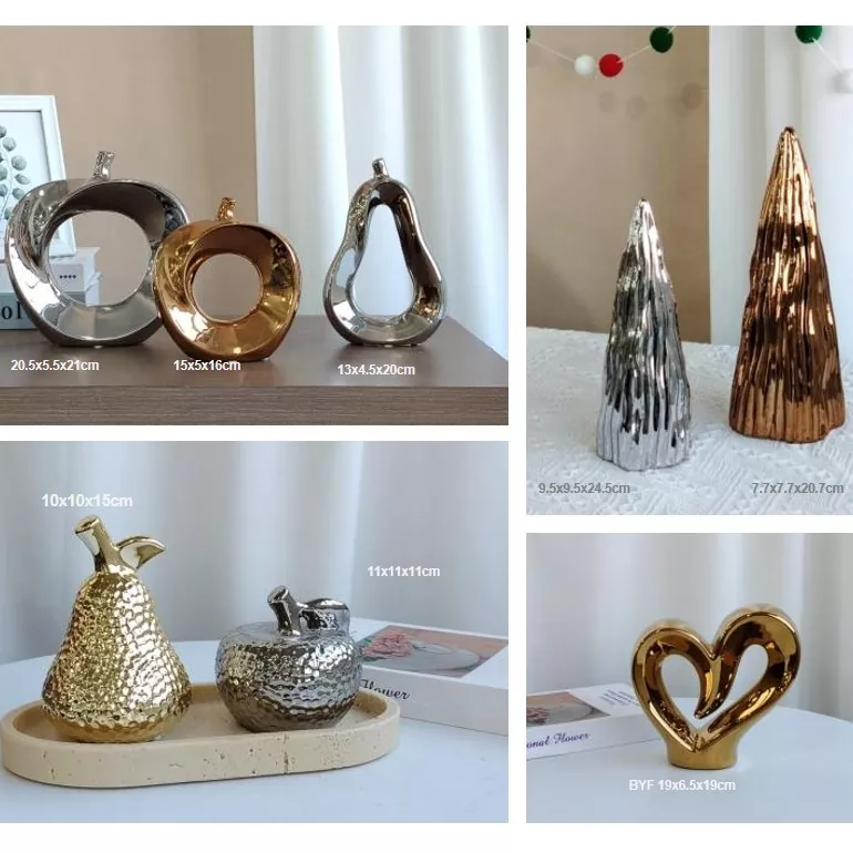 BYF의 특별한 세라믹 장식은 과일, 크리스마스 트리 및 하트를 특징으로합니다. 세라믹으로 만들어진 그들은 독특한 기술을 사용하여 금과 은색으로 제공되는 금속 광택을 만듭니다. 과일 디자인 (사과 및 배)에는 독특한 컷 아웃과 질감이있는 부드러운 선이 있습니다. 크리스마스 트리는 3 차원이며 풍부한 질감이 있습니다. 그리고 마음은 단순하고 우아하며 로맨스의 손길을 빌려줍니다. 이 우아하고 가벼운 촉촉한 작품은 거실이나 테이블에 적합하여 집에 예술적 감각과 스타일을 더합니다. 그들은 모든 공간의 분위기를 향상시키는 세련된 액세서리입니다.